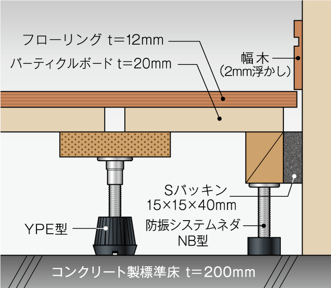 下の画像は少し違いますが、置床の脚の上にパーティクルボード+捨て貼りをした後に無垢のフローリングを貼る計画です。