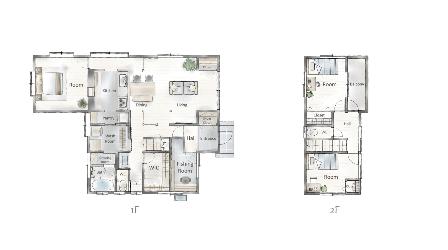 ご主人が当初から希望されていた釣り部屋を設ける一方で、奥様のご希望でランドリールームを取り入れ、家事動線にも配慮した設計となっています。