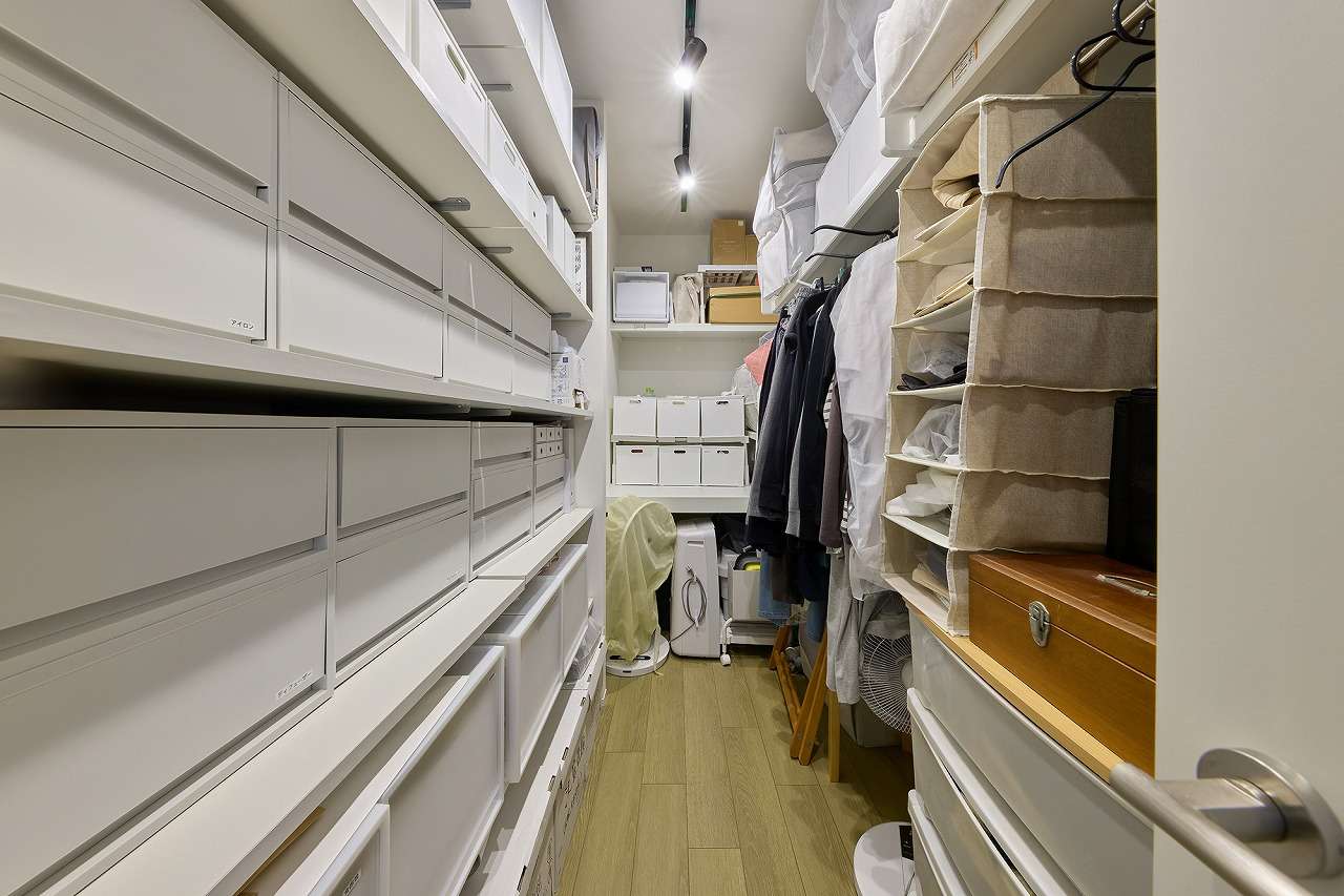ウォークインクローゼットに加え、玄関のハンガーラックや洗面室の可動棚など、必要な場所に適切な収納を設けることで、日常の片付けがしやすい住まいを実現しました。