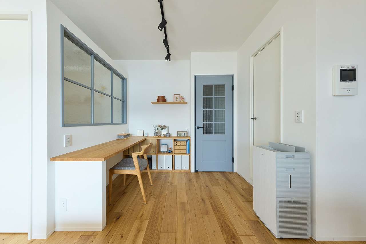 インテリアはブルーグレーを基調に、タイルや室内窓、リビングドアの色味を揃え、空間全体に統一感を持たせています。